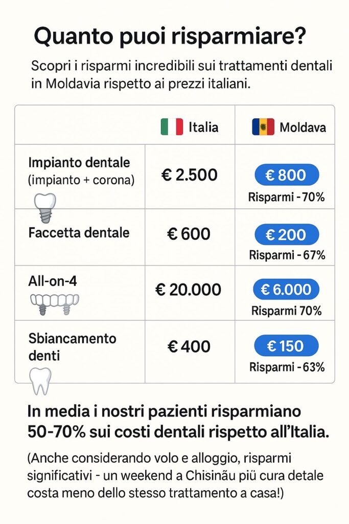 Scopri i risparmi incredibili sui trattamenti odontoiatrici in Moldavia rispetto ai prezzi italiani.